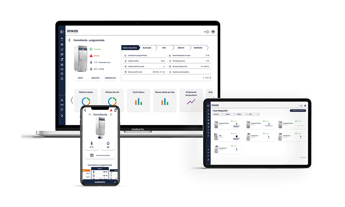 Überwachen Sie die Verfügbarkeit, Auslastung, Pflege und Hygiene Ihrer Geräte von einer einzigen Plattform aus. Abfrage von Zyklus- und HACCP-Daten in Echtzeit für eine sichere Verwaltung, die den Vorschriften entspricht.
