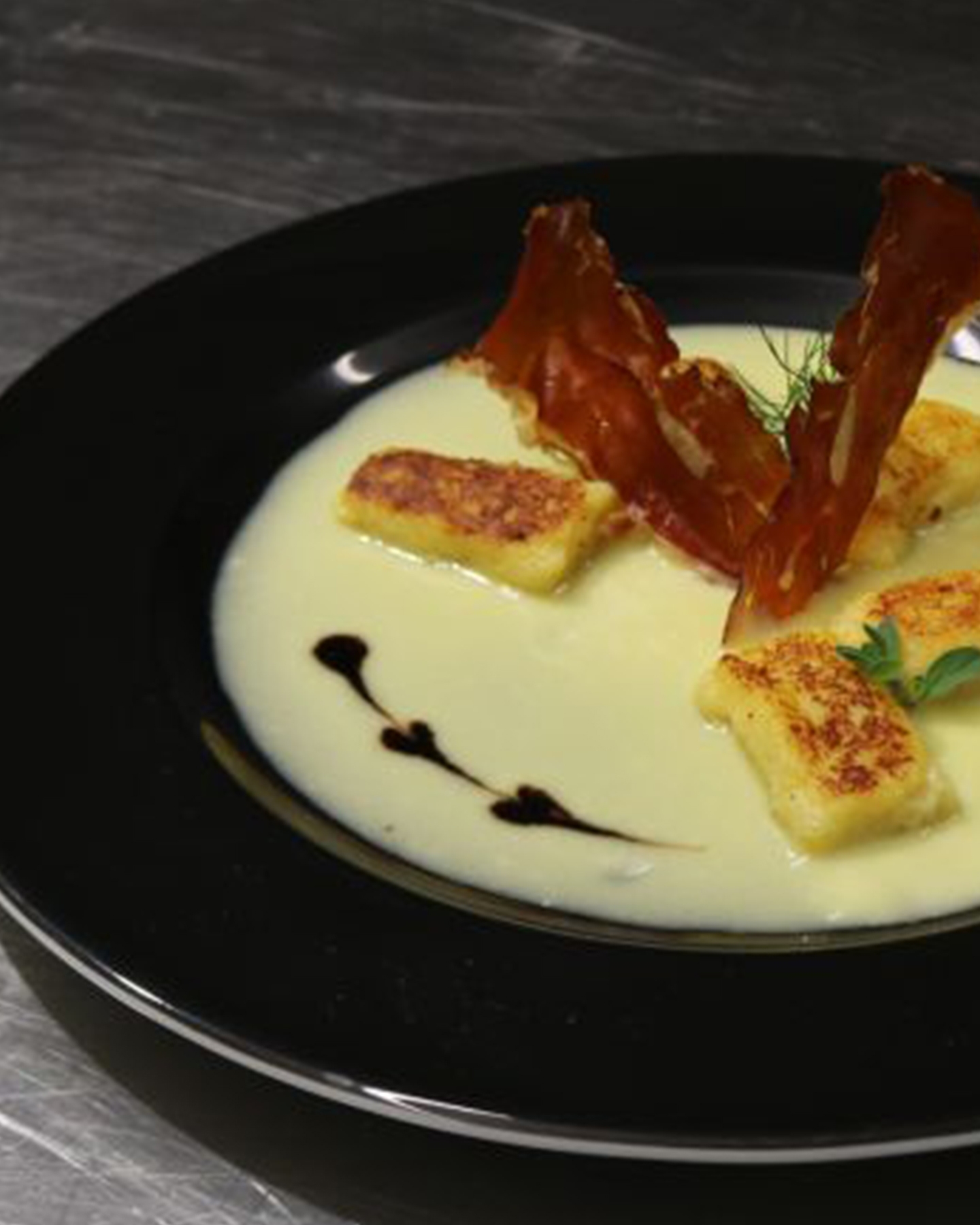 - Al momento del servizio cucinare gli gnocchi un abbondante acqua salata, scolarli e farli rosolare nel burro. Rigenerare la fonduta e disporla a specchio nel piatto. Appoggiare delicatamente gli gnocchi sulla salsa e decorare con croccante di speck e gocce di aceto balsamico.