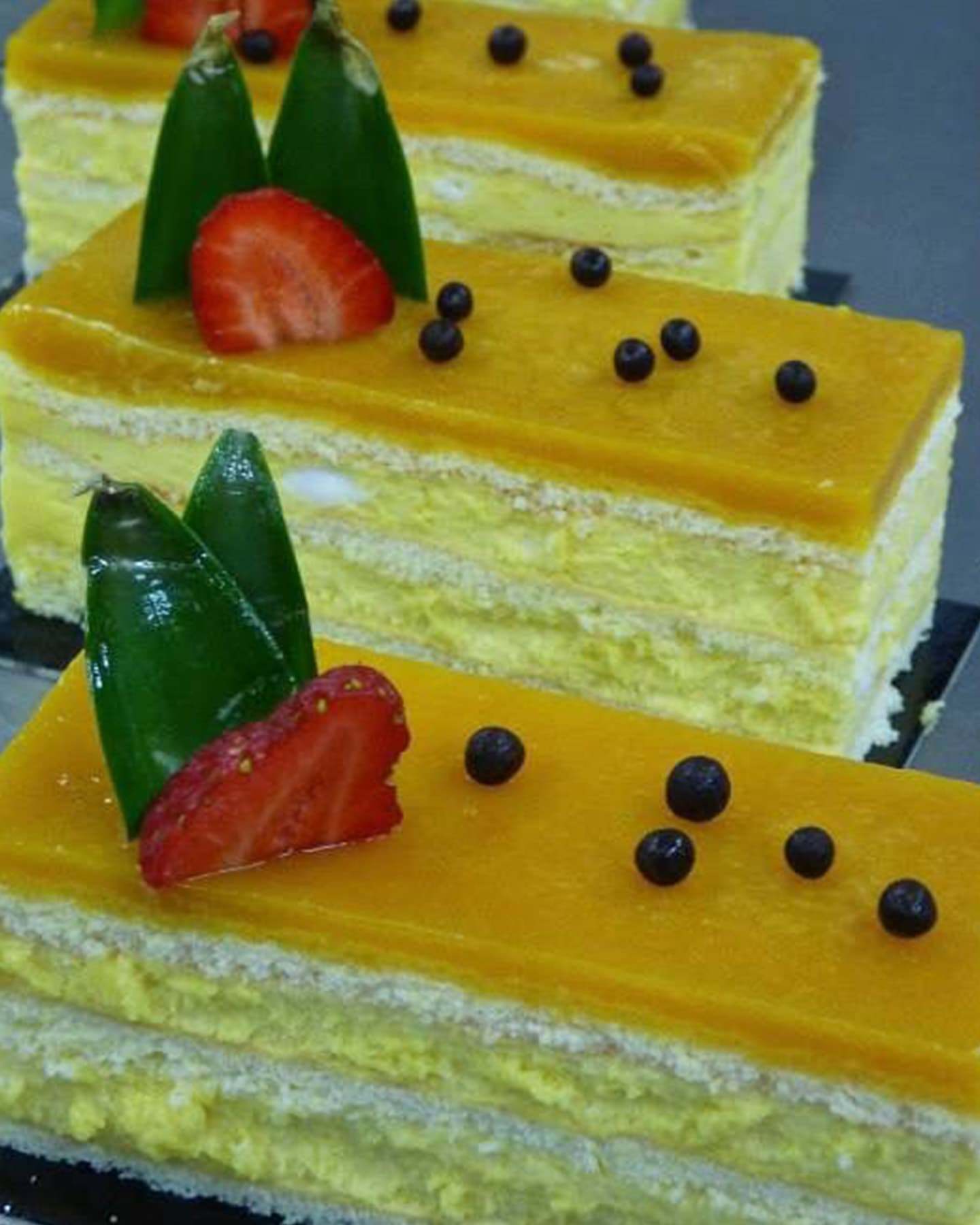 - Scaldare la purea di passion fruit con lo zucchero e unire la gelatina. Versare sulla mousse e abbattere di temperatura -18°C. Decorare con foglie di ananas.