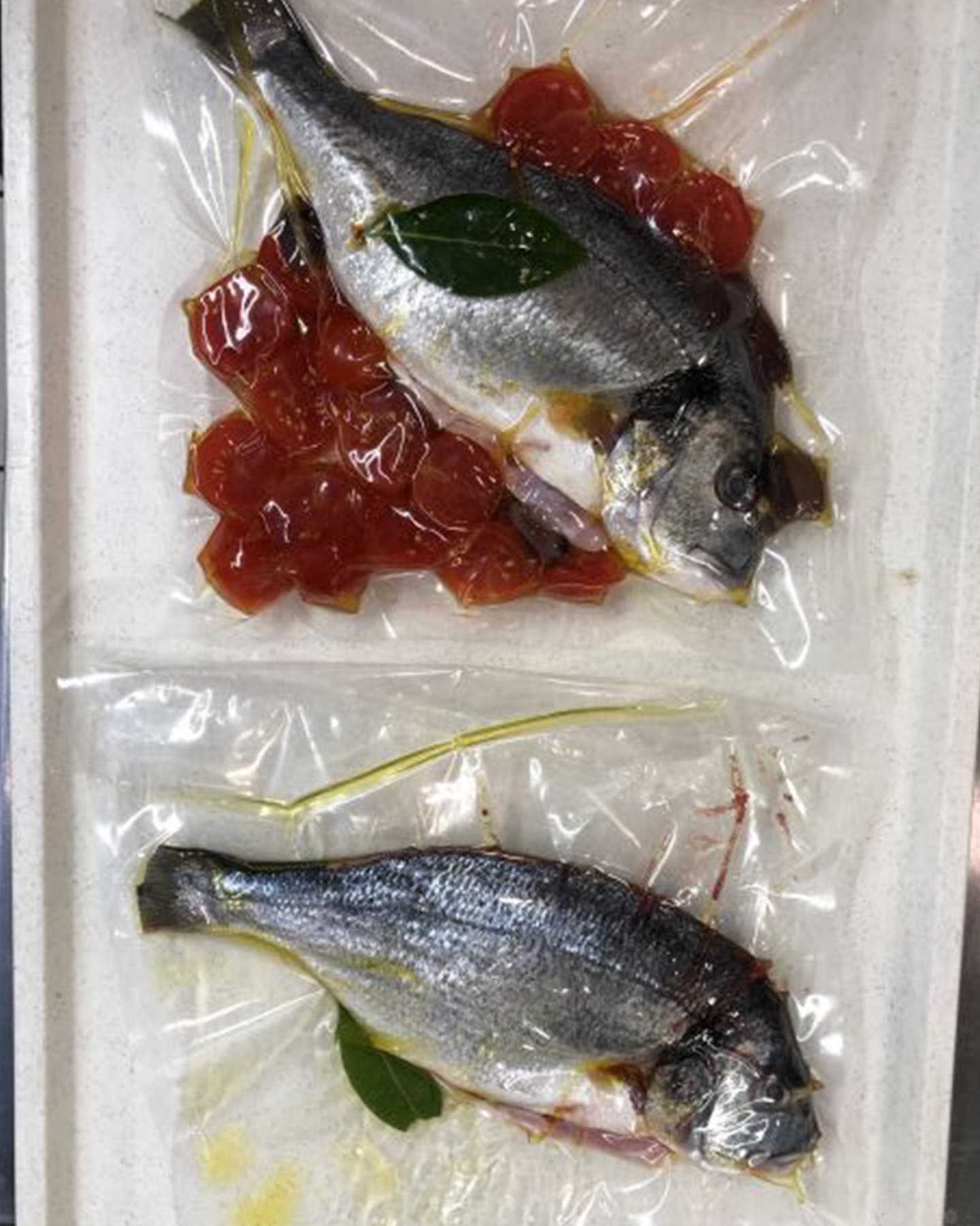 - Sistemare le orate nei sacchetti s.v., aggiungervi i complementi alimentari della ricetta ( in questo caso pomodorini ed olive) il sale bilanciato per il pesce e chiudere il sacchetto in vuoto pieno