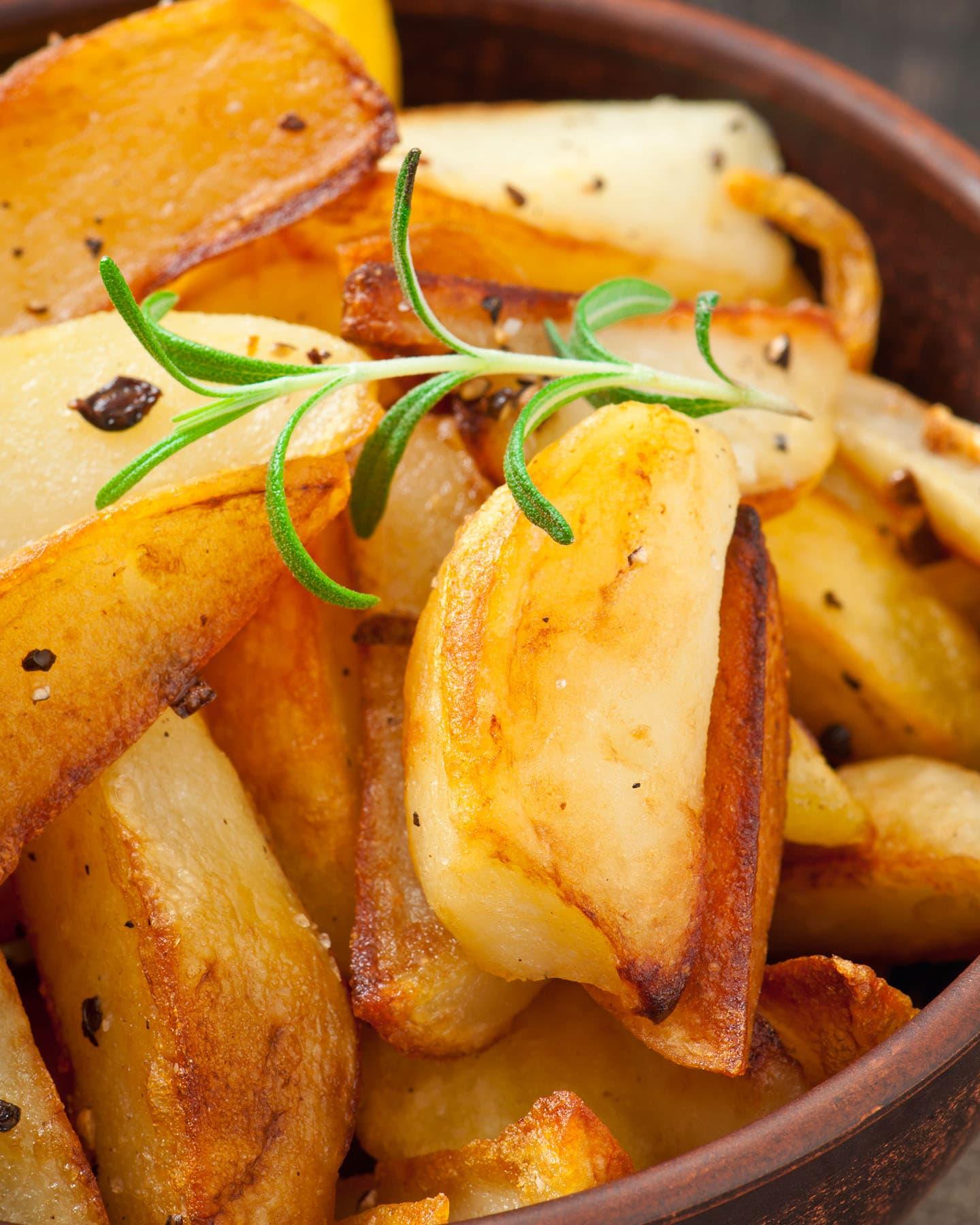 - Pelare e tagliare le patate, sbianchirle in forno a vapore su teglia forata per 3/4 minuti. Trasferirle su una teglia antiaderente e condire con olio, sale, pepe, il rosmarino e l'aglio privato dell'anima.