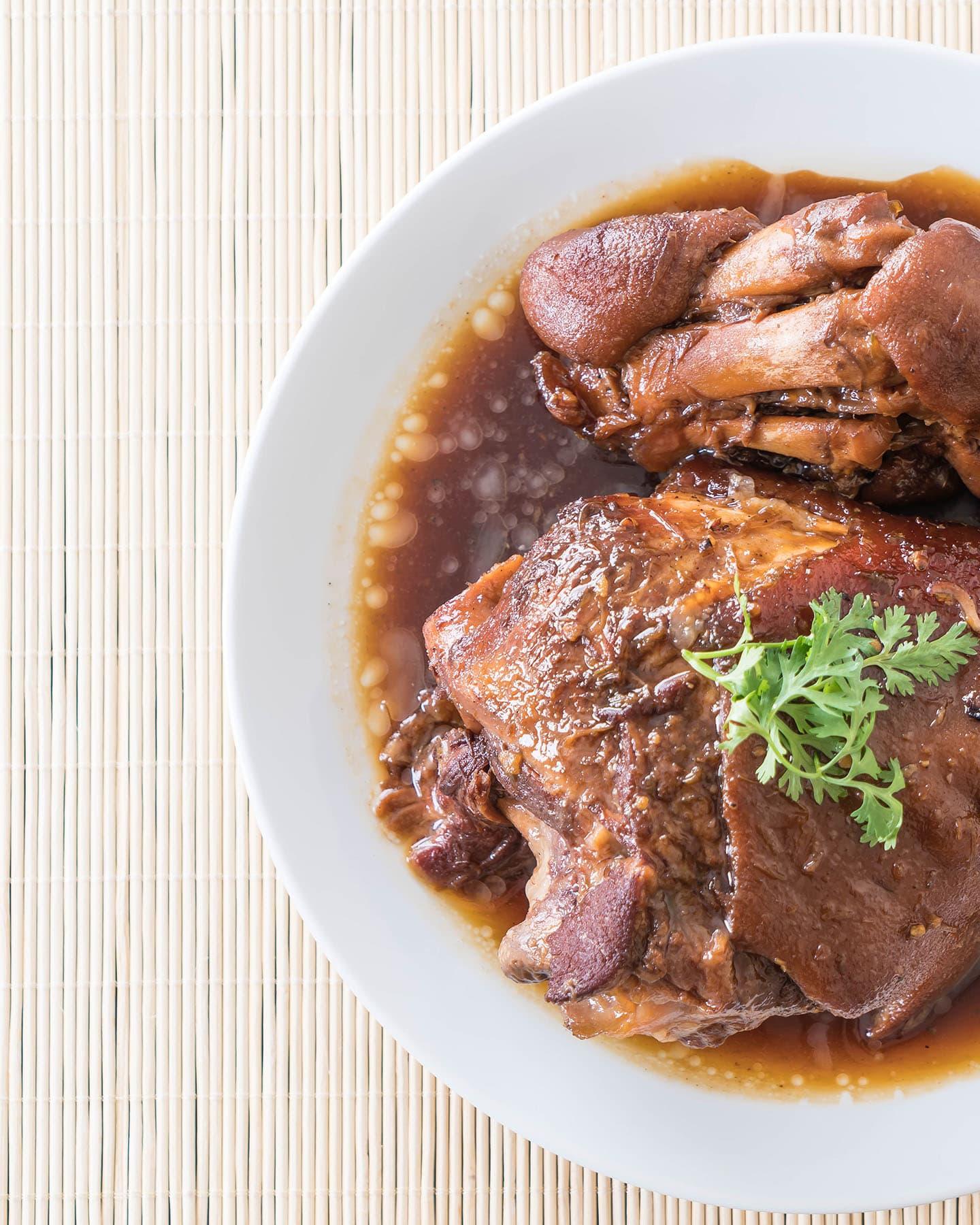 - Rosolare lo stinco in un'altra padella, filtrare la birra e mettere da parte le verdure. Siringare lo stinco con la birra e metterlo in una teglia con le verdure. Cuocere a +85°C per 8 ore.